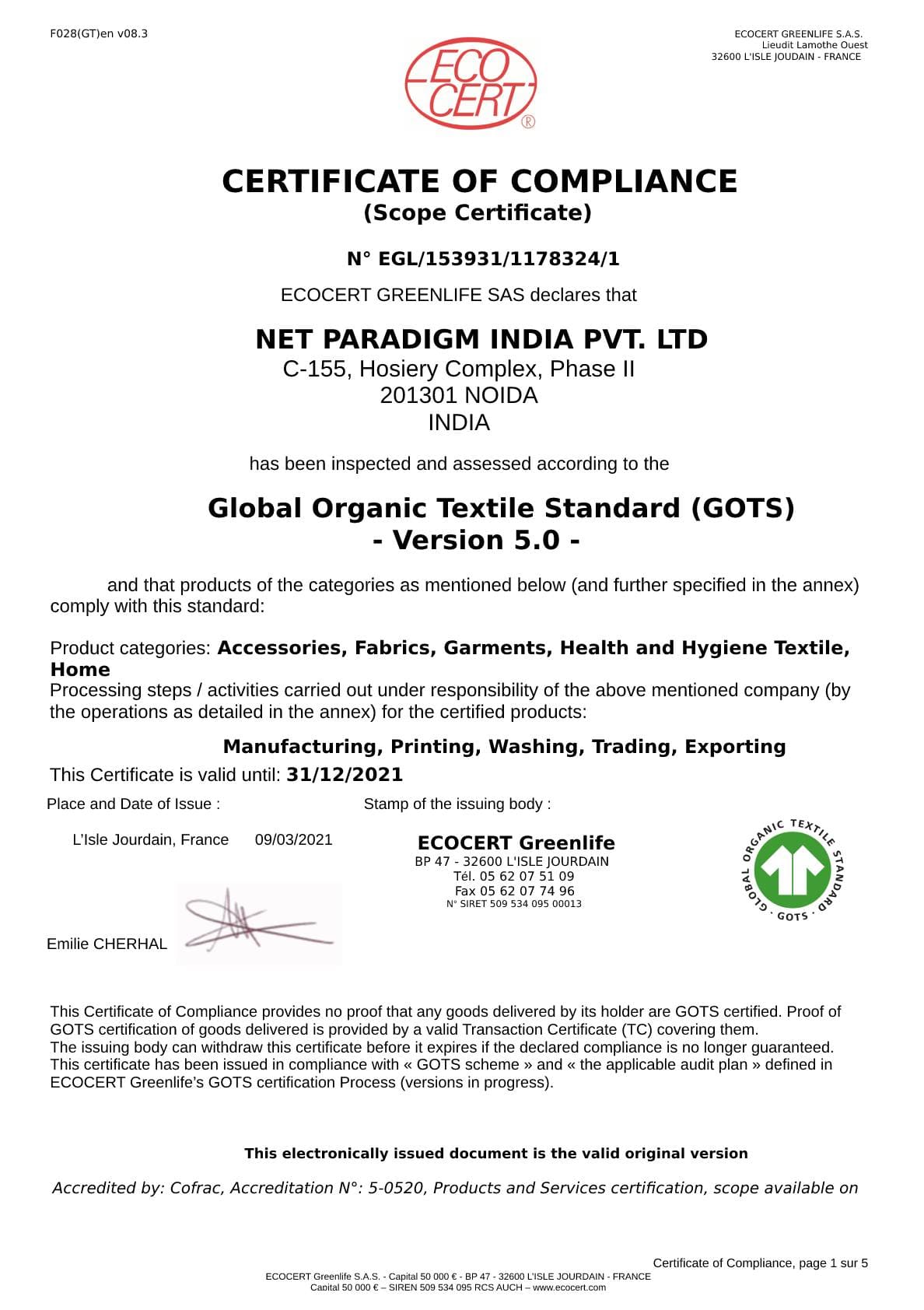 Ngoài ra, sản phẩm dệt may chỉ có thể được cấp chứng chỉ theo tiêu chuẩn OEKO TEX 100 khi tất cả các thành phần đáp ứng được các tiêu chí cần thiết – ví dụ như đối với quần áo, ngoài vải chính thì chỉ may, in ấn, nút, khoá kéo, nút bấm và tất cả phụ liệu được dùng làm ra quần áo phải hội đủ tiêu chuẩn cần thiết, tức là phải được kiểm nghiệm hoặc đã có chứng chỉ OEKO TEX 100.